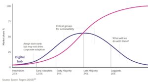 The Diffusion of innovation model from Everett Rogers shows how a new product is taken up over time. Sustainability comes when we reach a critical mass of people adopting the technology. .